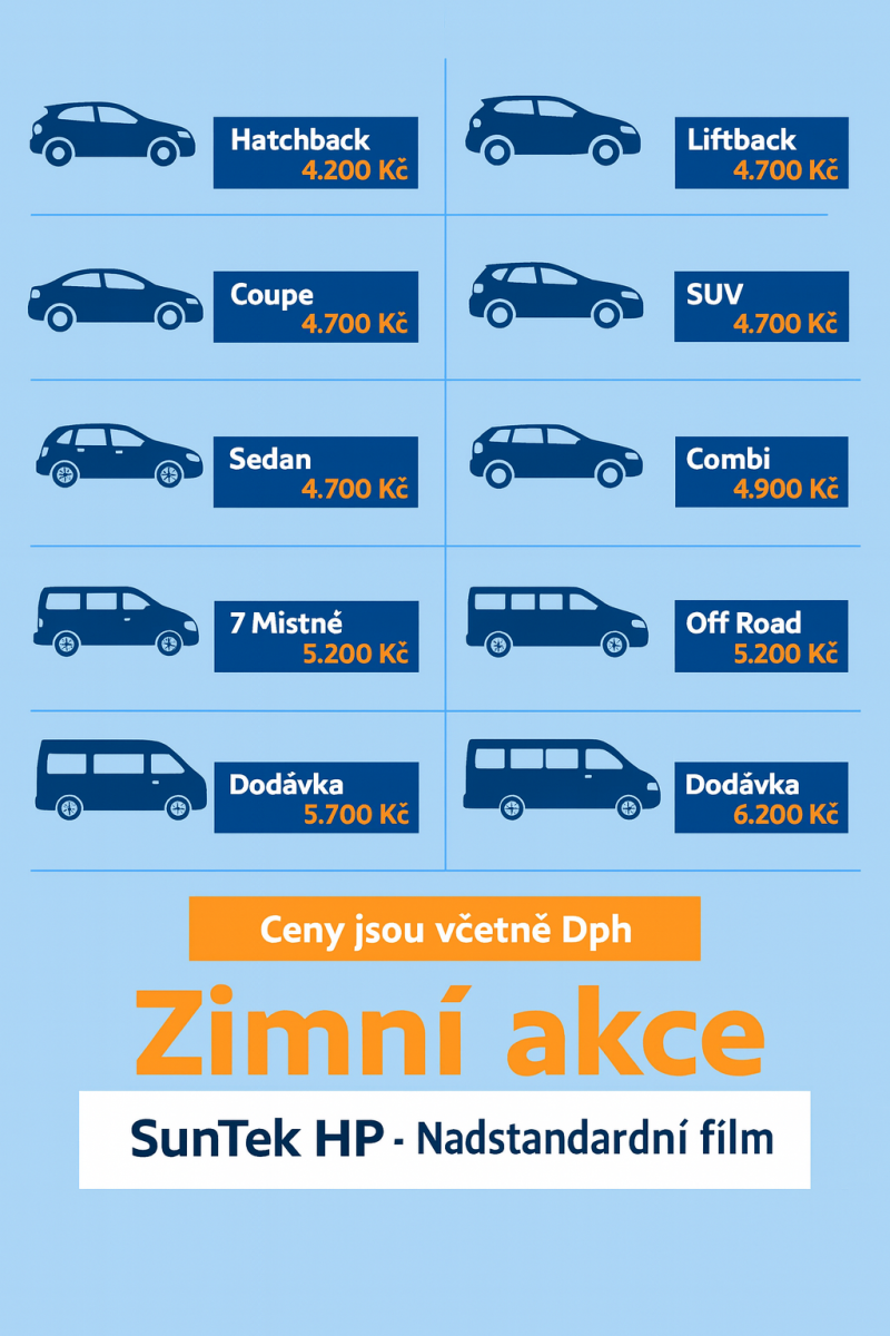 Ceny jsou vč. DPH a platí v případě, že montáž autofolie, nebude provedena na přední boční okna. Doplatek za montáž autofolie na přední boční okna 1200 Kč vč. DPH.